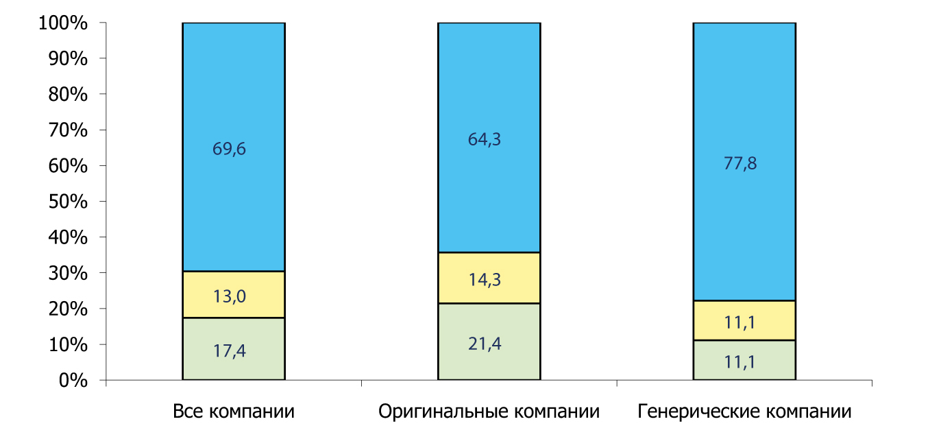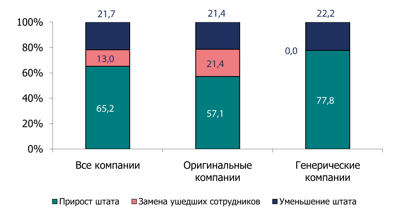 У першу чергу, ми постаралися відповісти на питання: яка буде політика найму? Якщо поглянути на дані 2013 (див. рис. 1), можна сказати, що 65,2% фармкомпаній активно наймали персонал, 13 - лише замінювали звільнених співробітників, 21,7% «оптимізували» чисельність штату - зменшили кількість працівників за період з березня по вересень 2013 (тобто за 7 місяців).