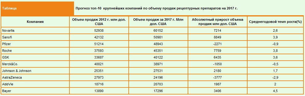 Обнадіює те, що лише для 3 з 10 досліджуваних компаній, як очікується, можливе скорочення чистого річного доходу за 2012-2017 рр.. З них як Merck & Co., так і Pfizer, за прогнозами, повинні продемонструвати збільшення обсягу продажів до кінця даного періоду (на початковій стадії прогнозного періоду очікується зменшення обсягу продажів обох американських корпорацій за рахунок посилення конкуренції в сегменті препаратів - генериків). Таким чином, AstraZeneca стала єдиною компанією, прогнозовані продажі якої в даний період будуть демонструвати стійке зниження.