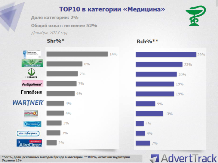 У категорії «Фармацевтика» за рекламними виходам лідирує Декатилен. Ново-Пасит займає друге місце в рейтингу. Замикає трійку лідерів компанія Herbalife.