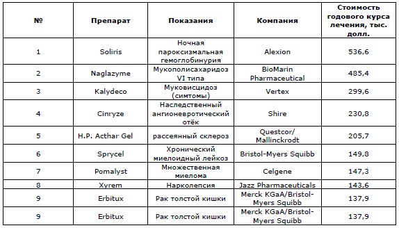 Так, у рейтингу TOP10 самим «дешевим» є препарат Revlimid компанії Celgene, курс терапії яким обходиться в 128,7 тис. дол, а найдорожчим -. (.. 536,6 тис дол за курс) препарат Soliris компанії Axelion (табл.). При цьому в 2013 р новий будинок в США можна було купити в середньому за 265 тис. дол, а на вторинному ринку і того дешевше -. за 197 тис. дол.